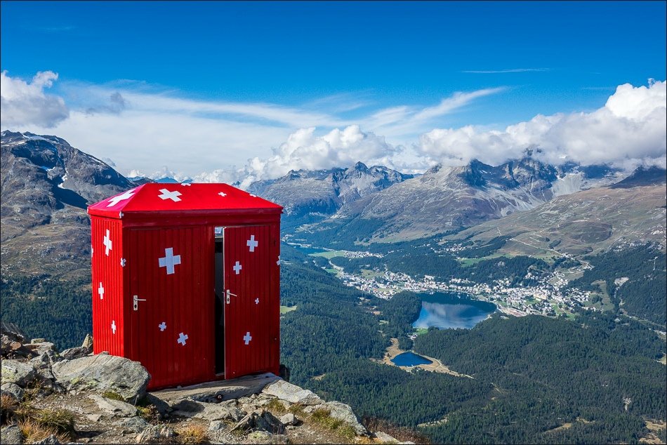 1- کوه های سوئیس همواره مناظر باشکوه کوهستان را به چشم ما نشان می دهند. نقاش معروف جیوانی سگانتینی فردی بود که در این کوه ها ساعت ها وقت صرف نقاشی از مناظر می کرد. کوه موتاس موراگل آخرین نقطه ای بود که سگانتینی در آن نقاشی کرد و بعدها به افتخارش یک توالت و البته کمی بالاتر یک جانپناه به نامش ساخته شد. این توالت یک نمای خیره کننده از کوه های اطراف را به ما می دهد