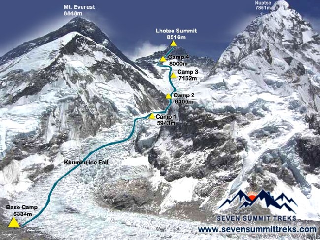 مسیر نرمال صعود لوتسه، این مسیر تا بالای کمپ 3 و در قسمتی که به نوار زرد مشهور است با مسیر نرمال صعود به قله اورست مشترک است